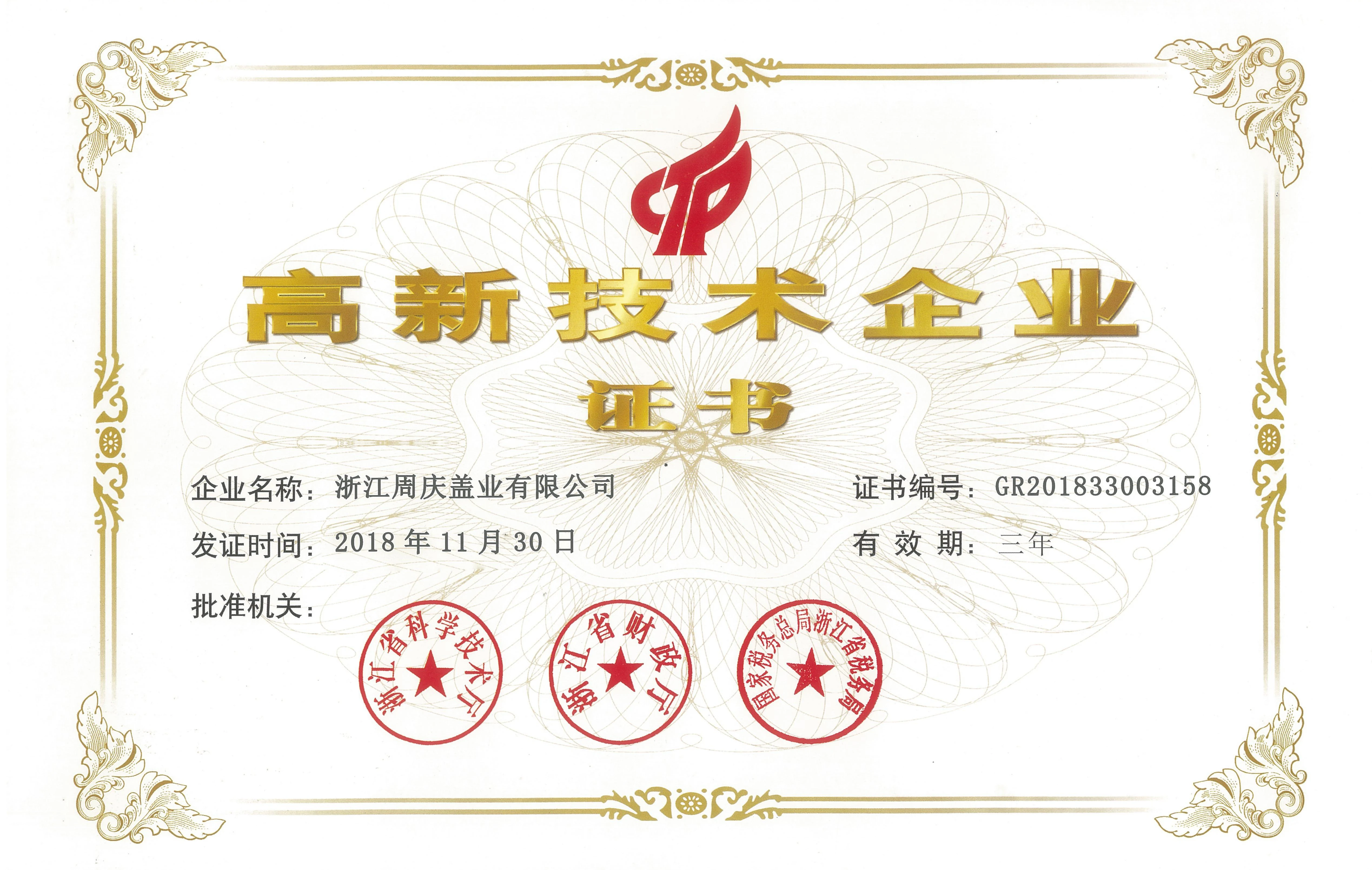 近日,浙江周庆盖业公司又传喜讯,公司荣获“高新技术企业”(证书编号:GR201833003158)。自2008年国家执行《高新技术企业认定管理办法》以来,公司首次通过了国家高新技术企业的认定,该证书由浙江省科学技术厅、浙江省财政厅、国家税务总局浙江省税务局共同颁发。